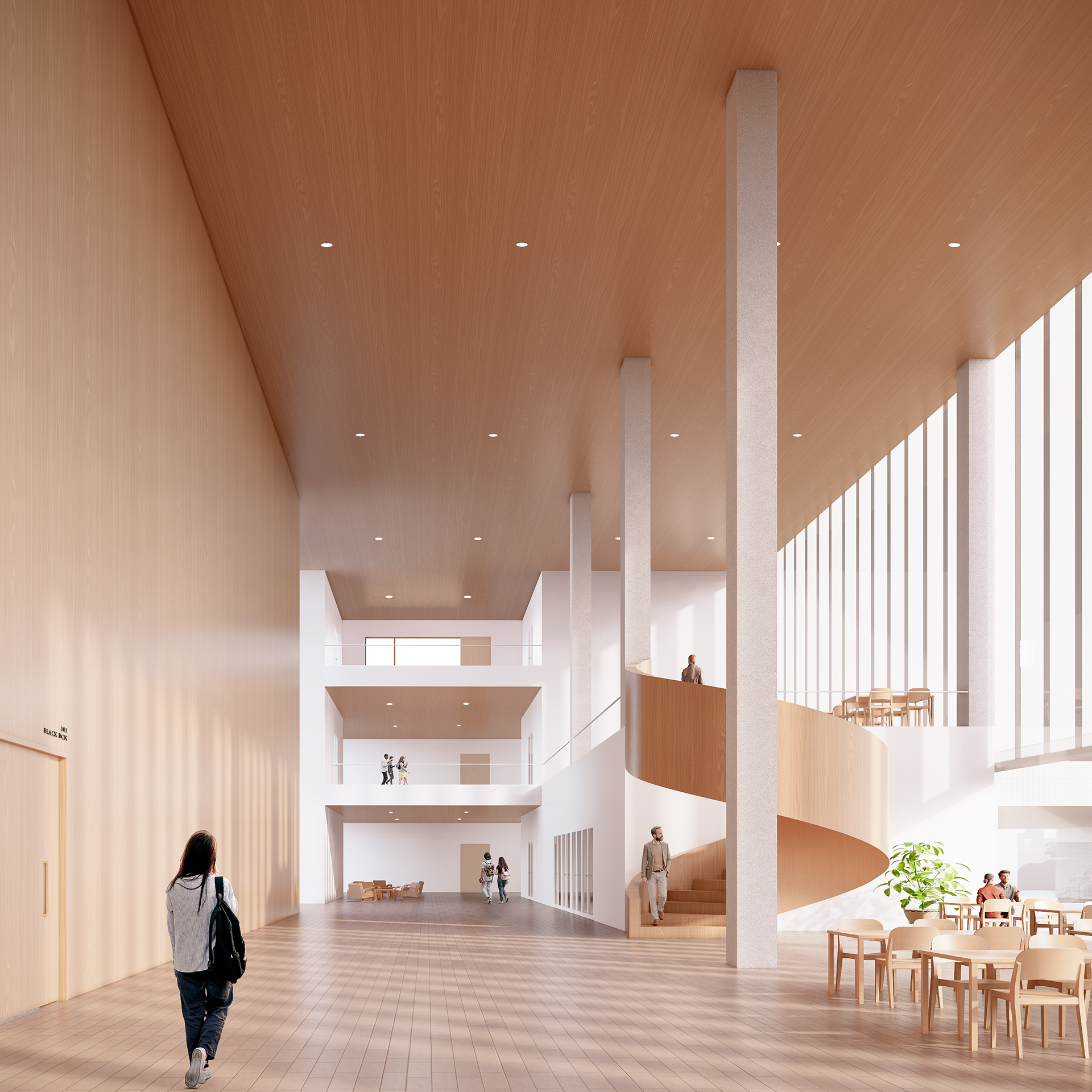The educational building forms the heart of the block. Its layout is based on a simple column grid that allows efficient and flexible use of space. The ground floor contains public and shared functions such as a lobby, restaurant, and a multipurpose hall, which can be opened toward the main square for events and community use. Teaching and workspaces are organized in the upper floors along clear corridors with natural light and visual connections between levels.