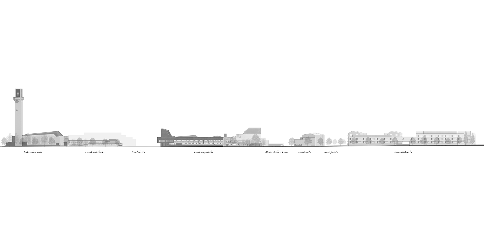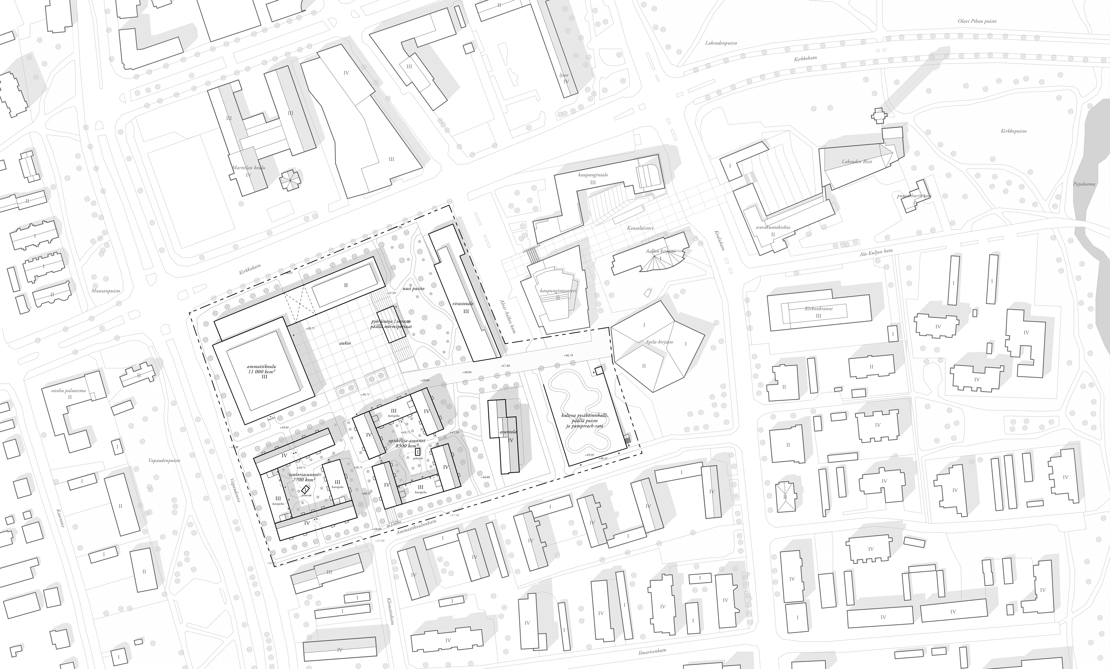 The plan consists of a new vocational school building, student and senior housing, and a series of connected outdoor spaces. The building masses are arranged to respect key cityscape views toward the Aalto Center, including the Apila Library and Lakeuden Risti Church. The composition complements the existing modernist city structure while defining new urban spaces with a clear and balanced scale.