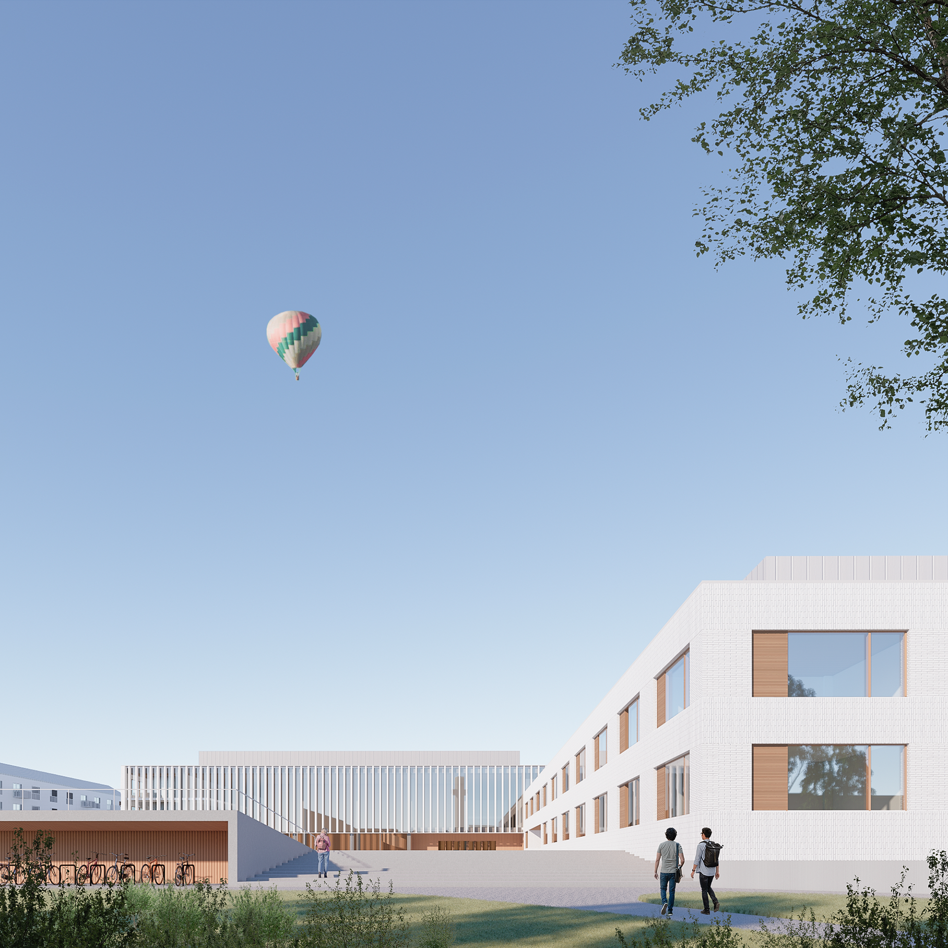 The residential buildings on the southern side of the site provide housing for students and seniors. Their scale and roof forms relate to the surrounding neighbourhood, and the courtyards and roof terraces support a sense of community. The ground floors include small commercial and shared spaces that bring activity to the street and the central square.