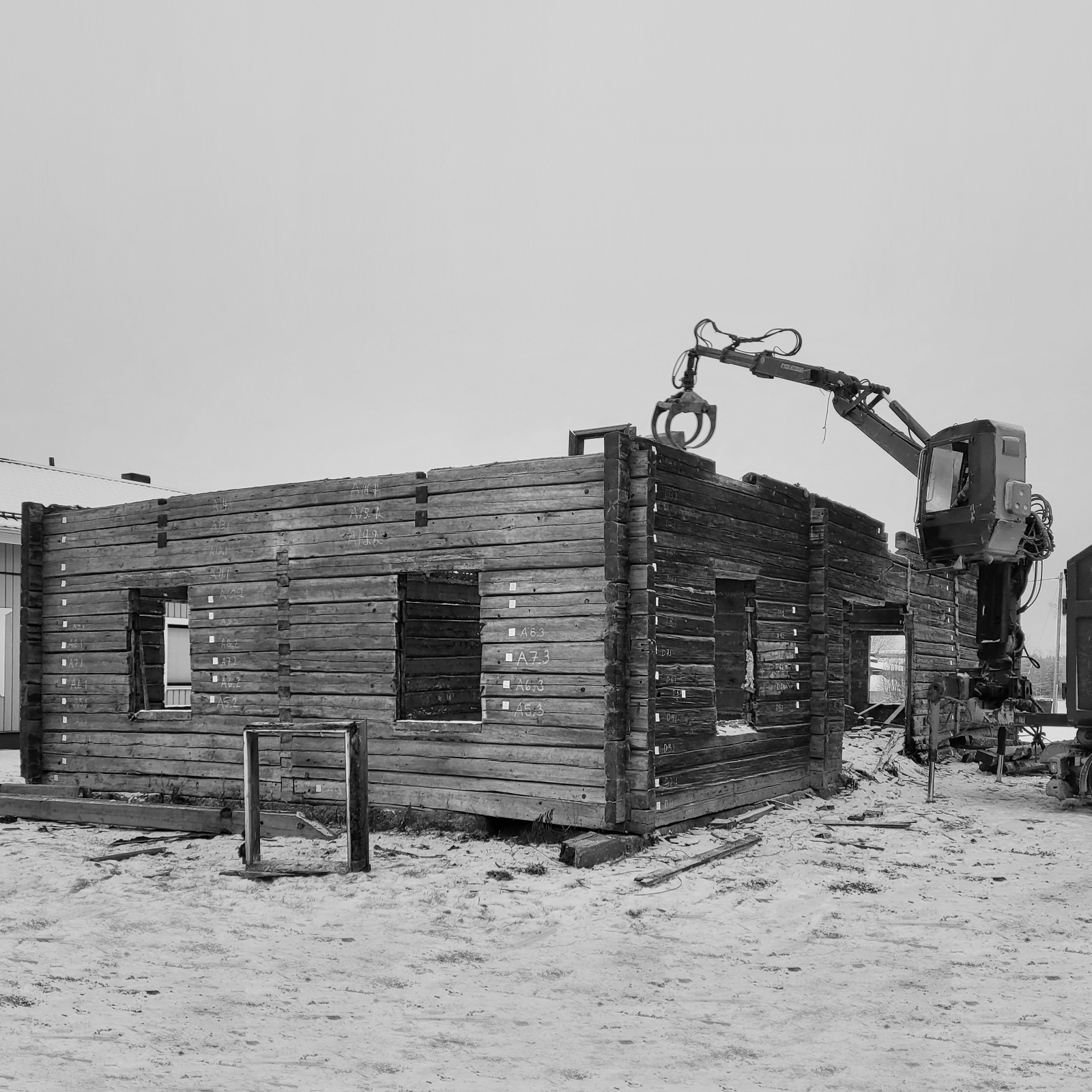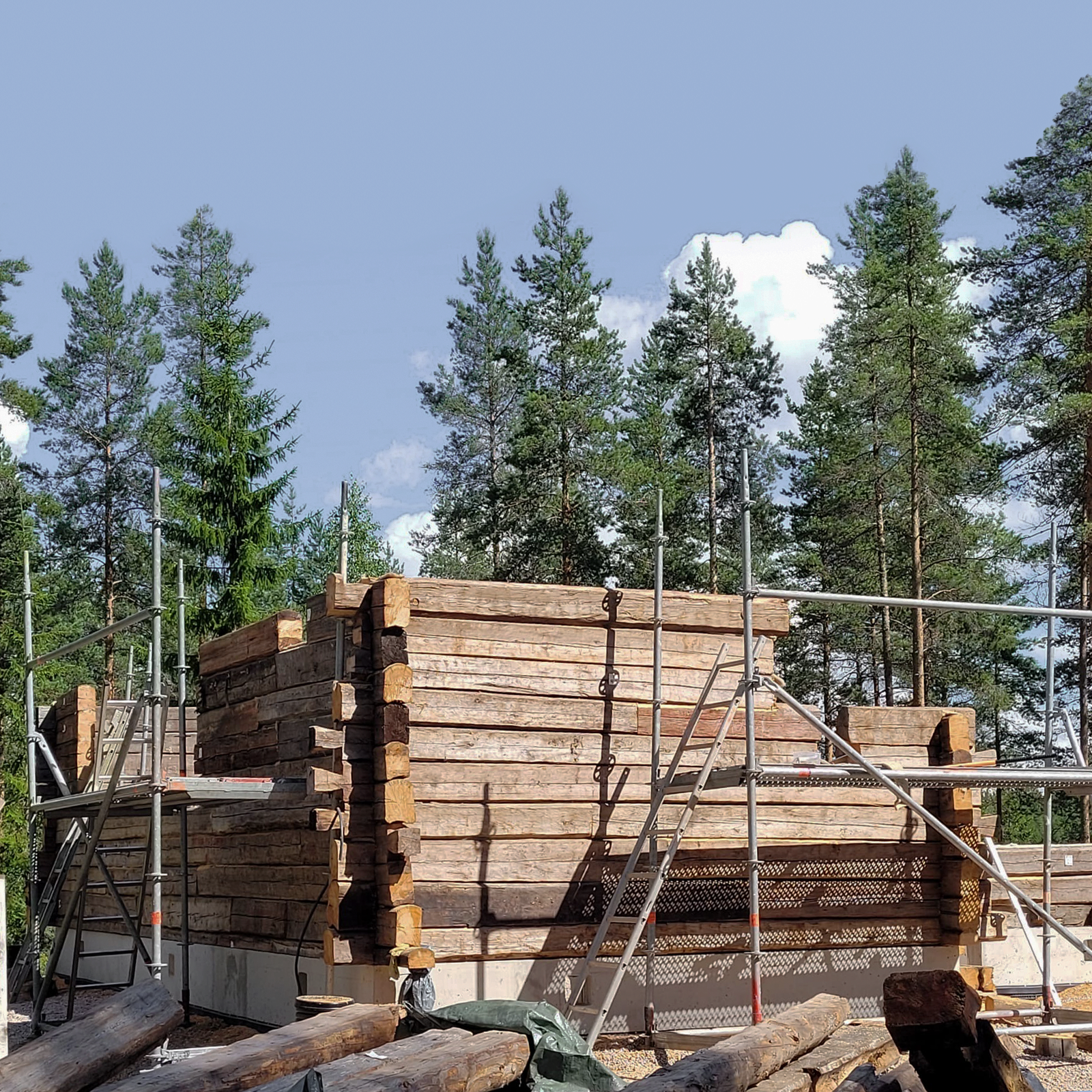 In the beginning of 2023, the massive log frame of the client’s childhood home was carefully dismantled, documented, and prepared for reuse. Each timber, over a century old, reflects the craftsmanship of its time and became the foundation for the new design. The salvaged logs were transported to a new site set within a scenic ridge landscape, where the structure was reassembled and adapted for contemporary living.