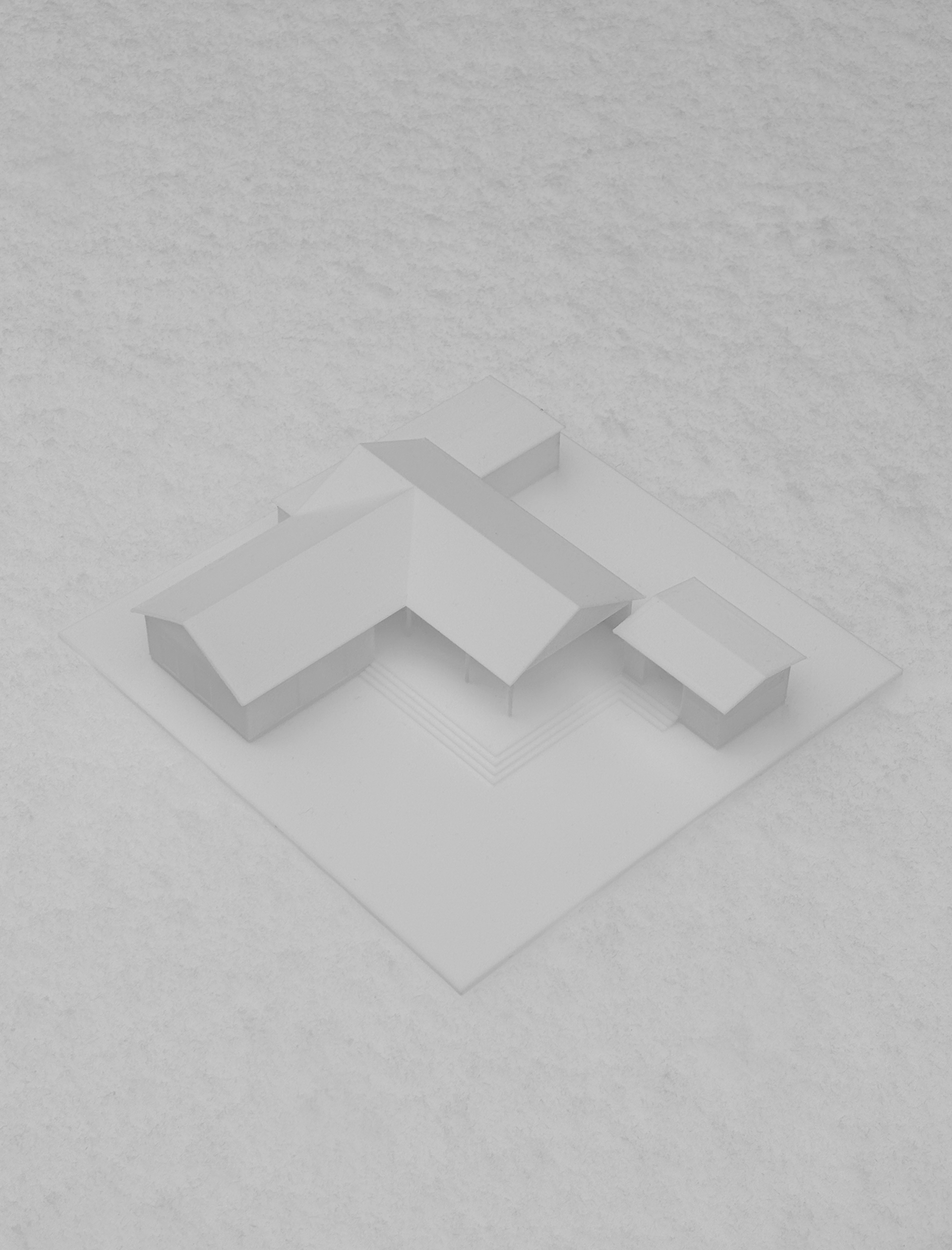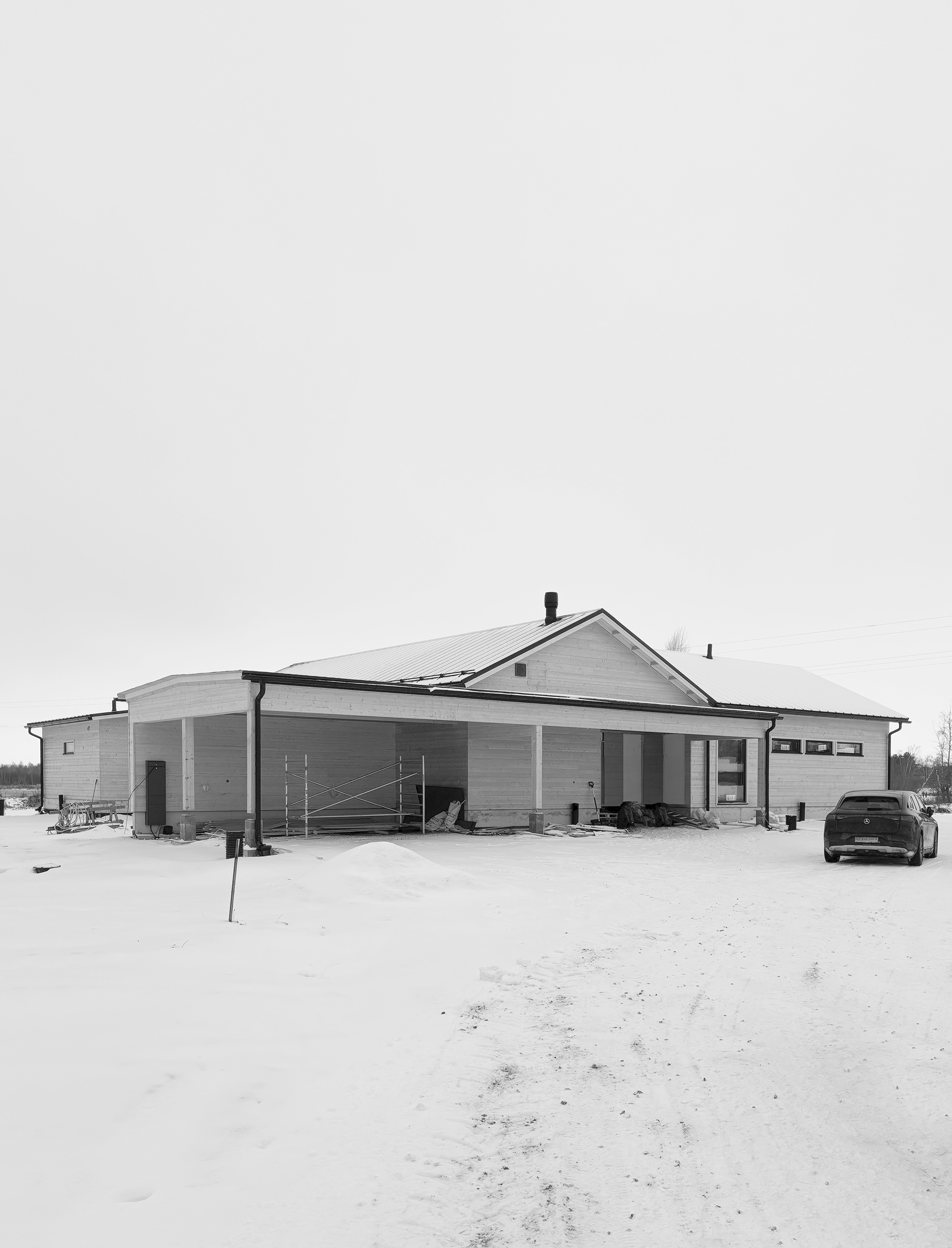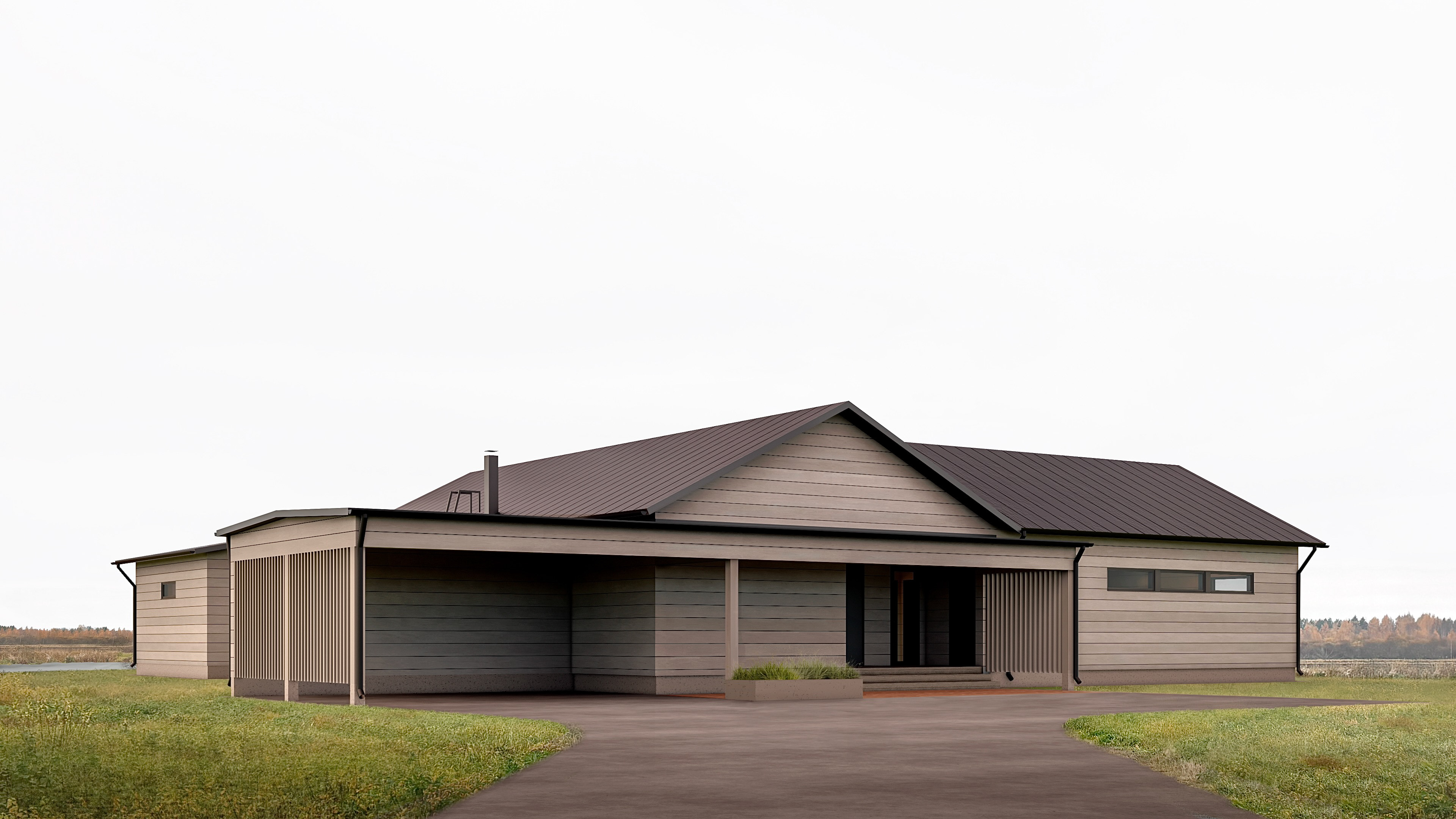 The architectural concept is based on an L-shaped volume with a simple pitched roofs. This primary mass is complemented by a connected carport and a separate sauna, together forming a coherent composition on the site. The home includes three bedrooms, an office, and a guest room. The living and dining spaces open toward the backyard through large glazed façades, creating a strong visual connection between the interior and the surrounding landscape.