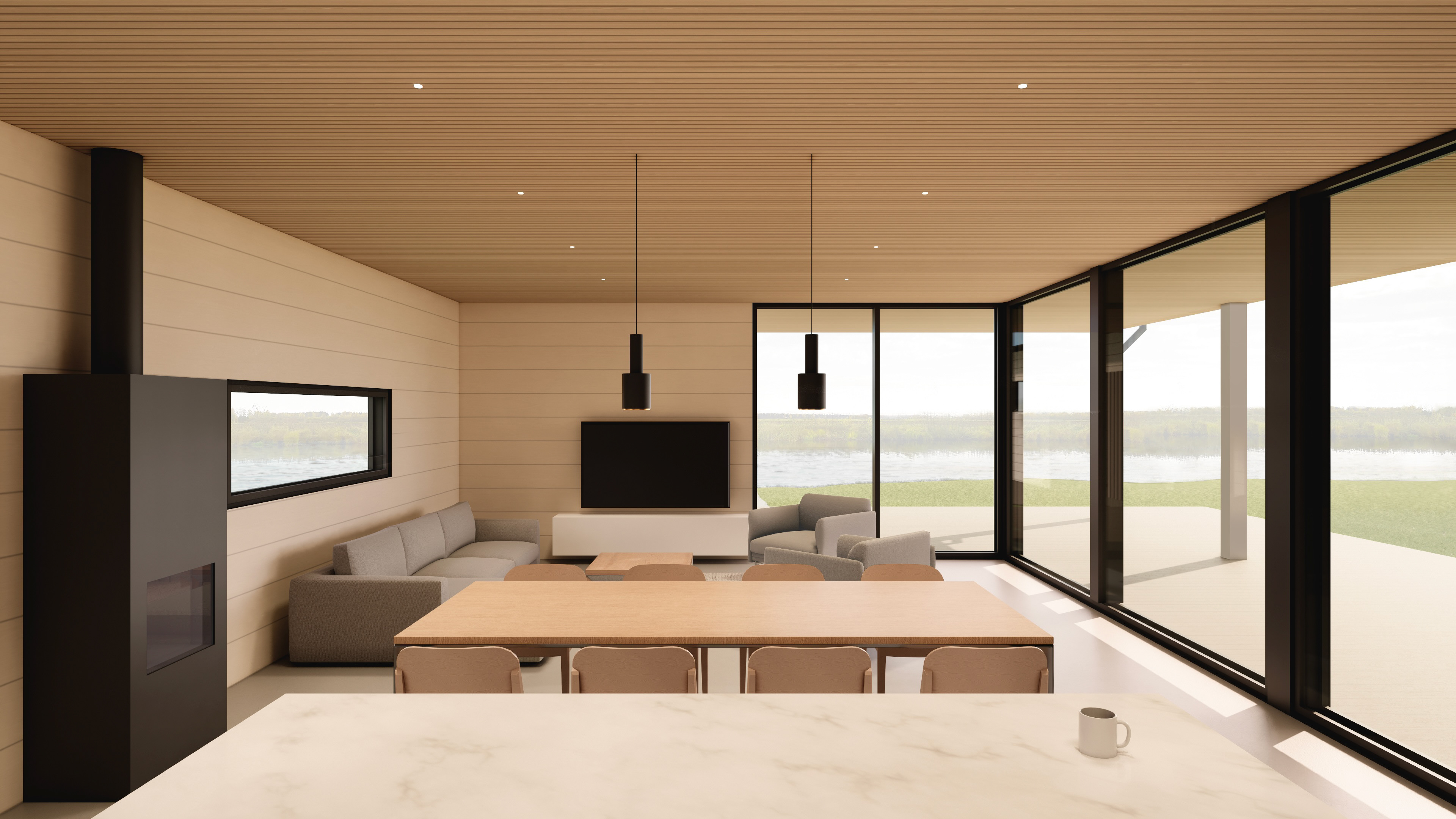 The design brings together the client’s diverse functional needs with a clear architectural language. The façades are treated with a greying technique that allows the timber surfaces to blend naturally into the landscape over time, reinforcing the building’s calm and understated presence. The interior design is guided by a warm, timeless, and subtly contrasting aesthetic.