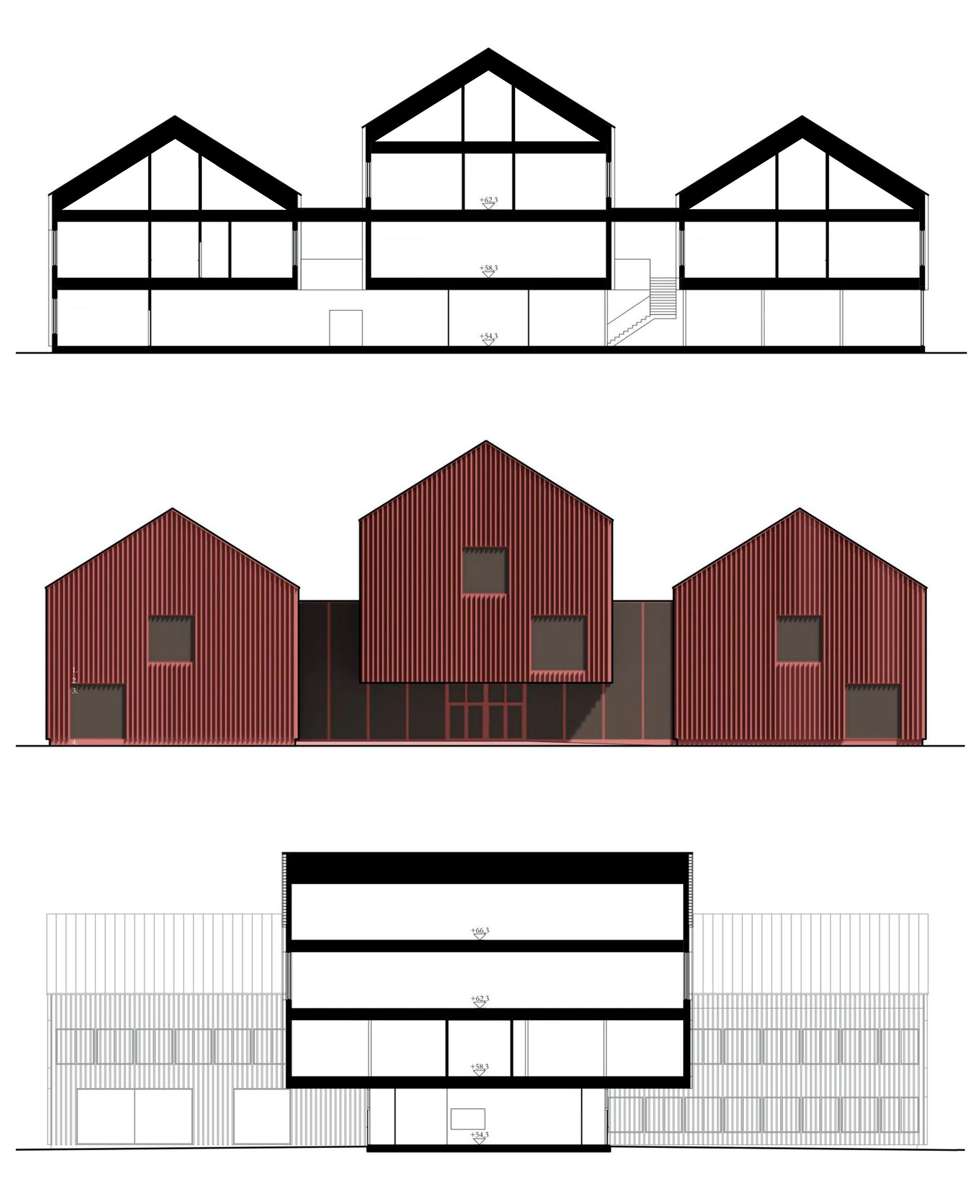 The new city hall consists of three gable-roofed volumes, a familiar archetype of the Finnish periphery. The composition preserves key cityscape views toward Kurikka Church, while forming a welcoming public square that extends to the nearby marketplace. The central mass rises slightly higher, subtly marking the building’s public role and the location of its main entrance, lobby and the council hall.