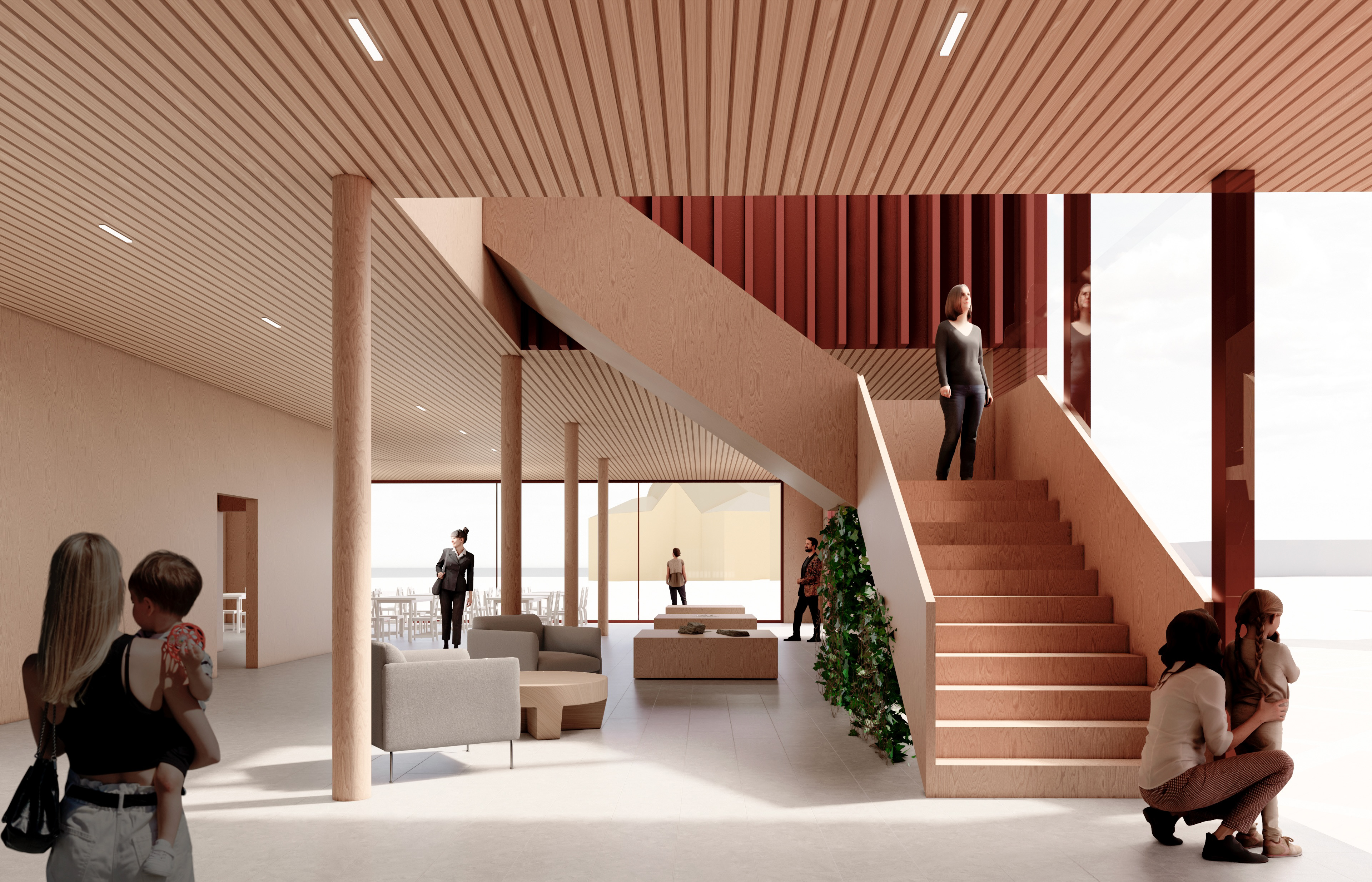 The building is designed as a CLT structure with a pillar-slab system, emphasizing local production, circularity, and long-term sustainability. The standardized modular approach supports flexible use, efficient construction, and future adaptability. Technical systems are integrated discreetly, and the simple structural logic enhances both buildability and end-of-life recyclability.